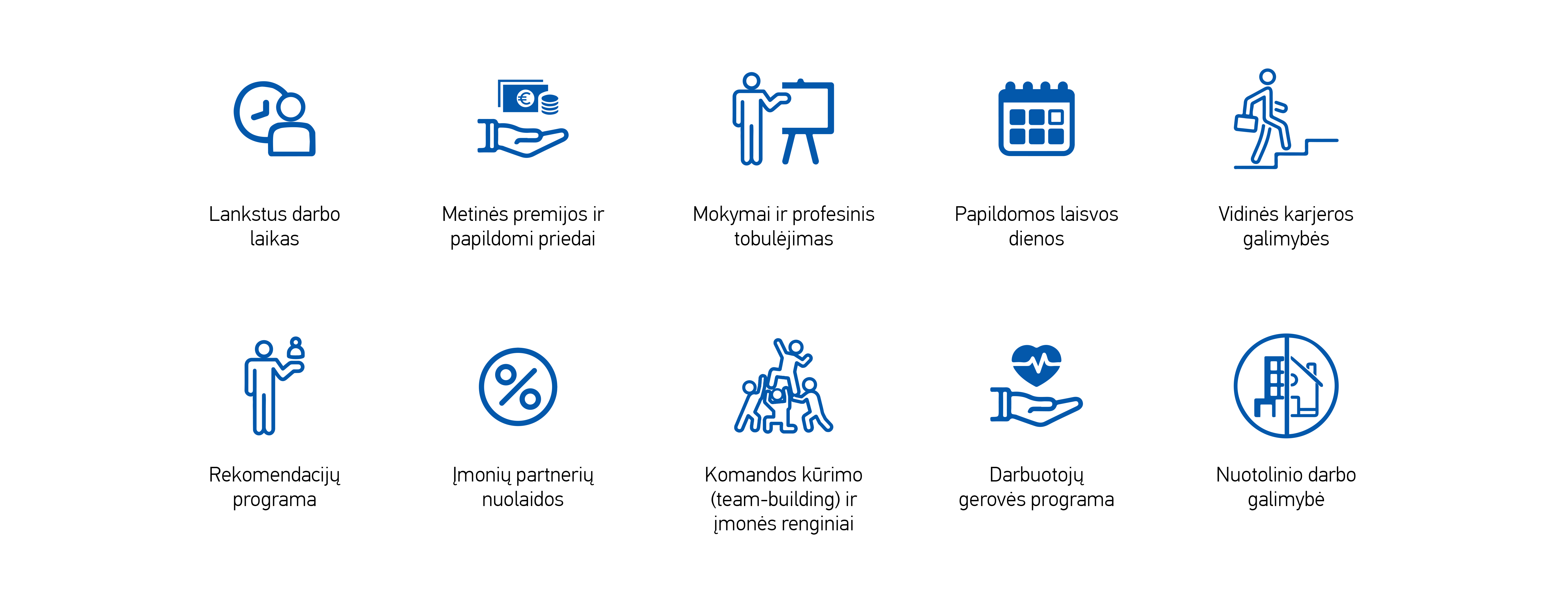 Darbo užmokestis nuo 1700-2450 EUR (brutto), priklausantis nuo kandidato kompetencijų ir patirties;